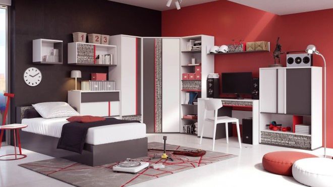 Korpusy mebli są białe natomiast fronty to połączenie kontrastowych czerwonych uchwytów z bielą, grafitem oraz motywem graficznym. Uniwersalny design tej kolekcji sprawdzi się zarówno w pokoju dziewczynki, jak i chłopca.