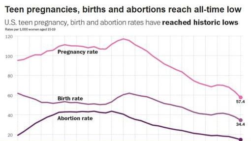 W „Washington Post” ukazał się interesujący artykuł o nastolatkach rodzących dzieci. Okazuje się, że w USA znacznie zmniejszyła się ilość ciężarnych nastolatek w wieku 15-19 lat, podobnie jak ilość dokonywanych przez nich aborcji.