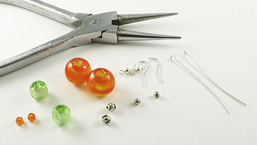 dwie posrebrzane szpilki o długości ok. 5 cm,para posrebrzanych bigli (zapięć),dowolnie dobrane korale szklane,małe przekładki lub kuleczki - metalowe lub posrebrzane,szczypce - tzw. bociany - do zagięcia szpilek.