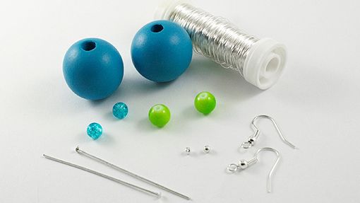 dwa duże korale drewniane z dużymi dziurkami,cztery mniejsze koraliki szklane,dwie małe kuleczki posrebrzane,jedna para szpilek i para bigli,cienki drut posrebrzany lub srebrny,szczypce "bociany".